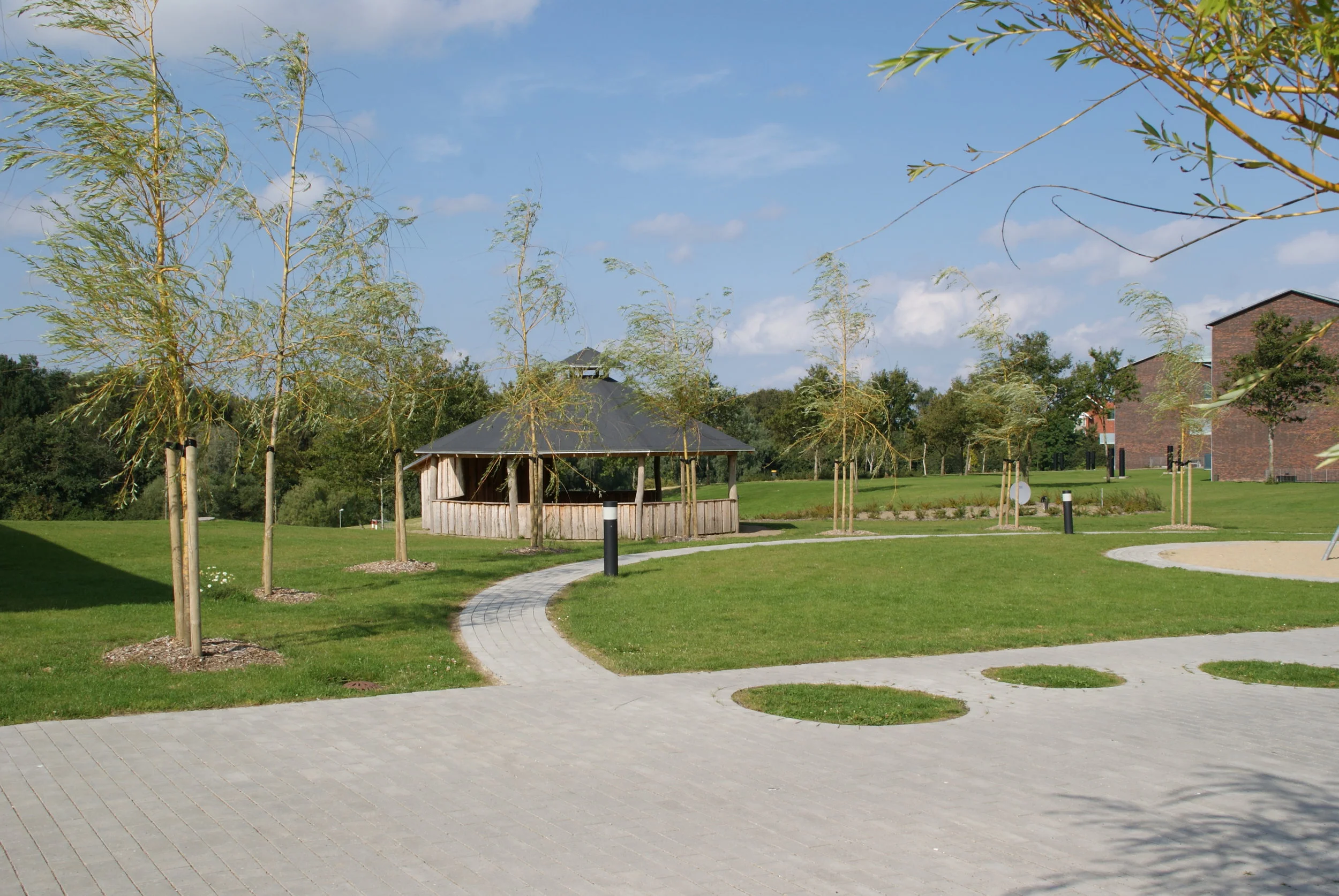 Midt i parkanlægget findes i dag en markant beplantning ved en halvcirkel. Heri etableres et cirkulært opholdsareal med opholdsmuligheder ved bænke omkring træer, og der anlægges en bålplads i midten af arealet.