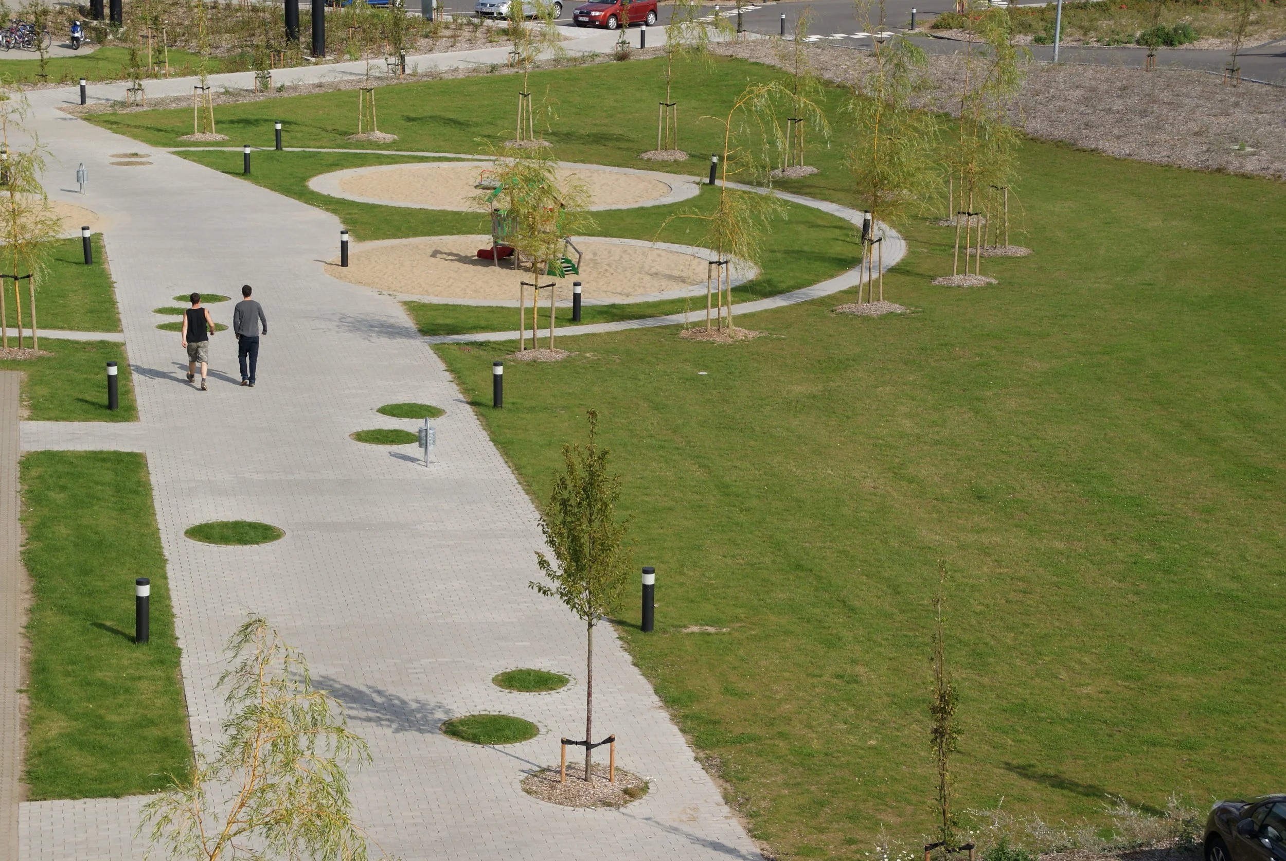 Som hovedgreb anlægges en hovedsti – en ”Promenade” – der forbinder boligblokkene sammen på langs af området. Promenaden tænkes trukket væk fra bygningerne, så den kommer til at ligge frit på arealerne, og ikke opleves som en decideret adgangssti til boligerne, men netop som en hovedfærdselsåre i boligområdet.