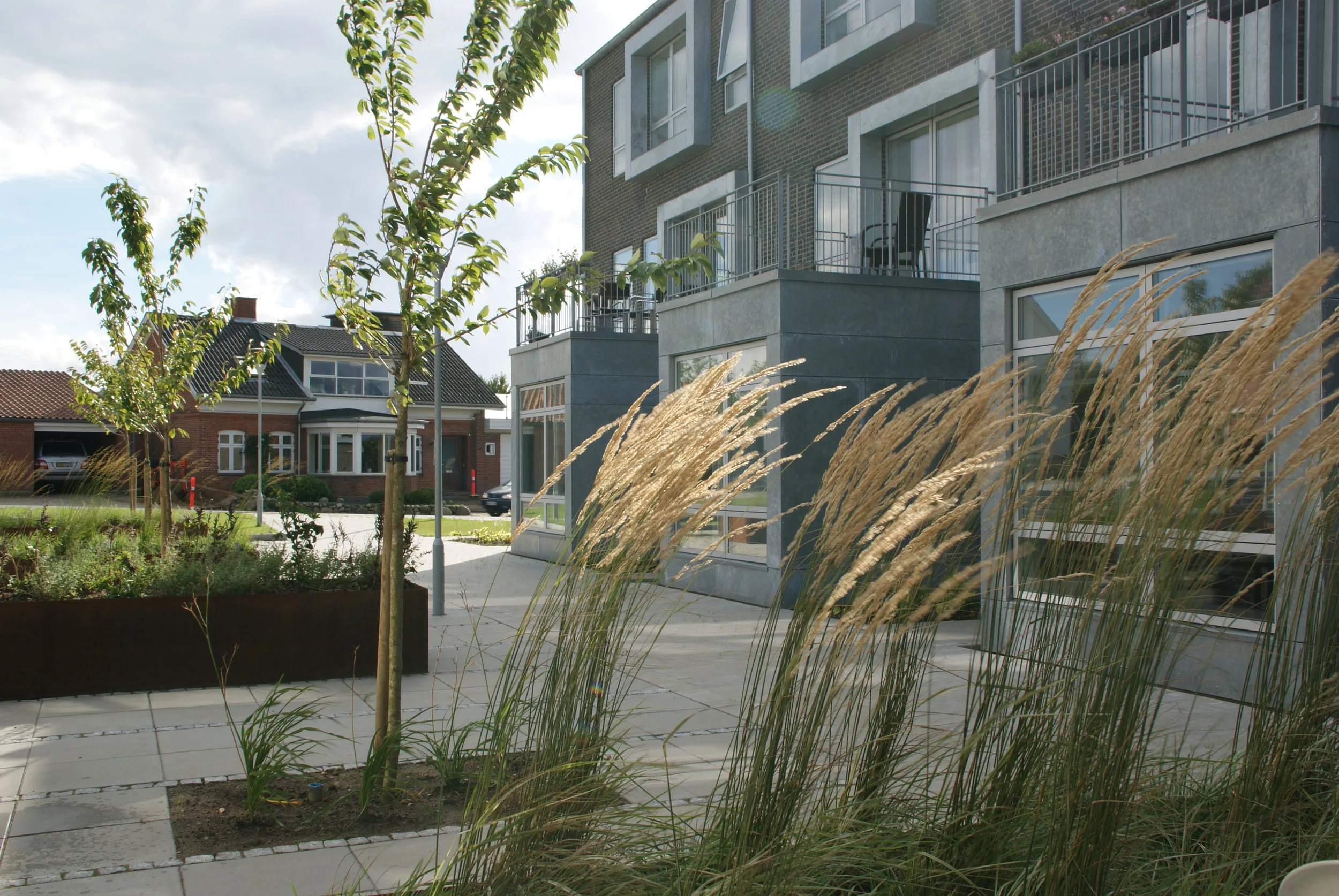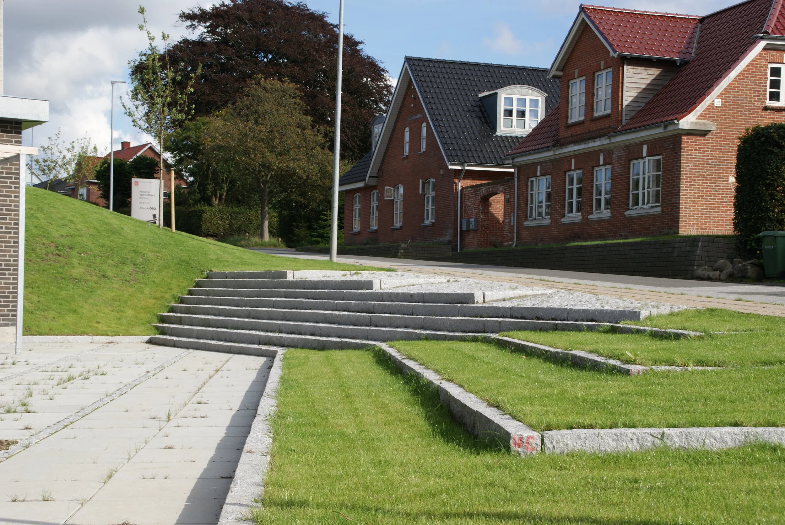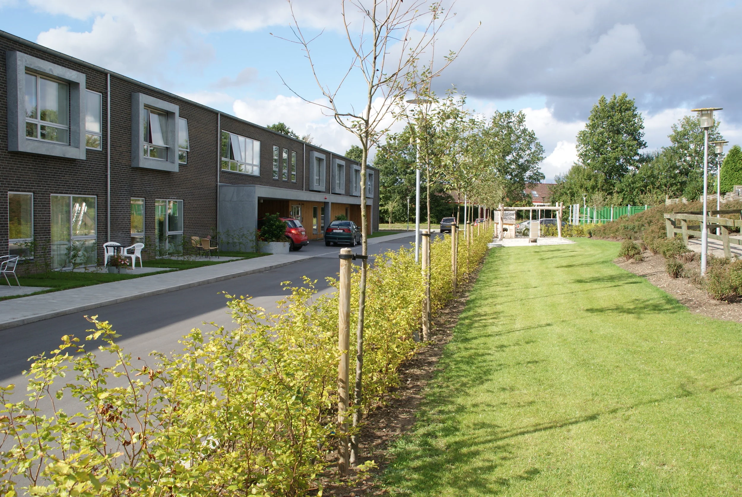 Landskabet omkring plejecentret tager udgangspunkt i genkendelige elementer fra det danske landskab og de danske haver.