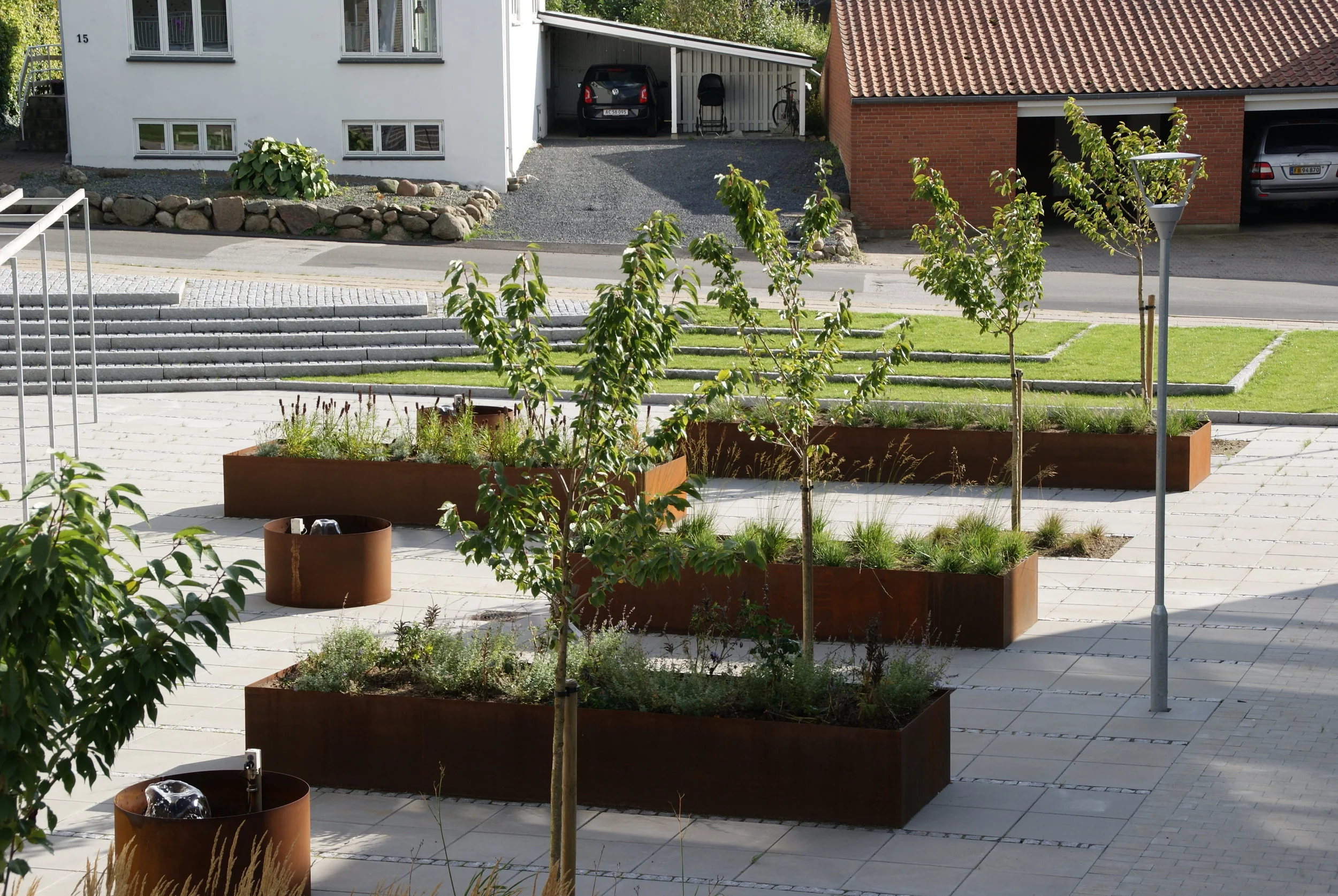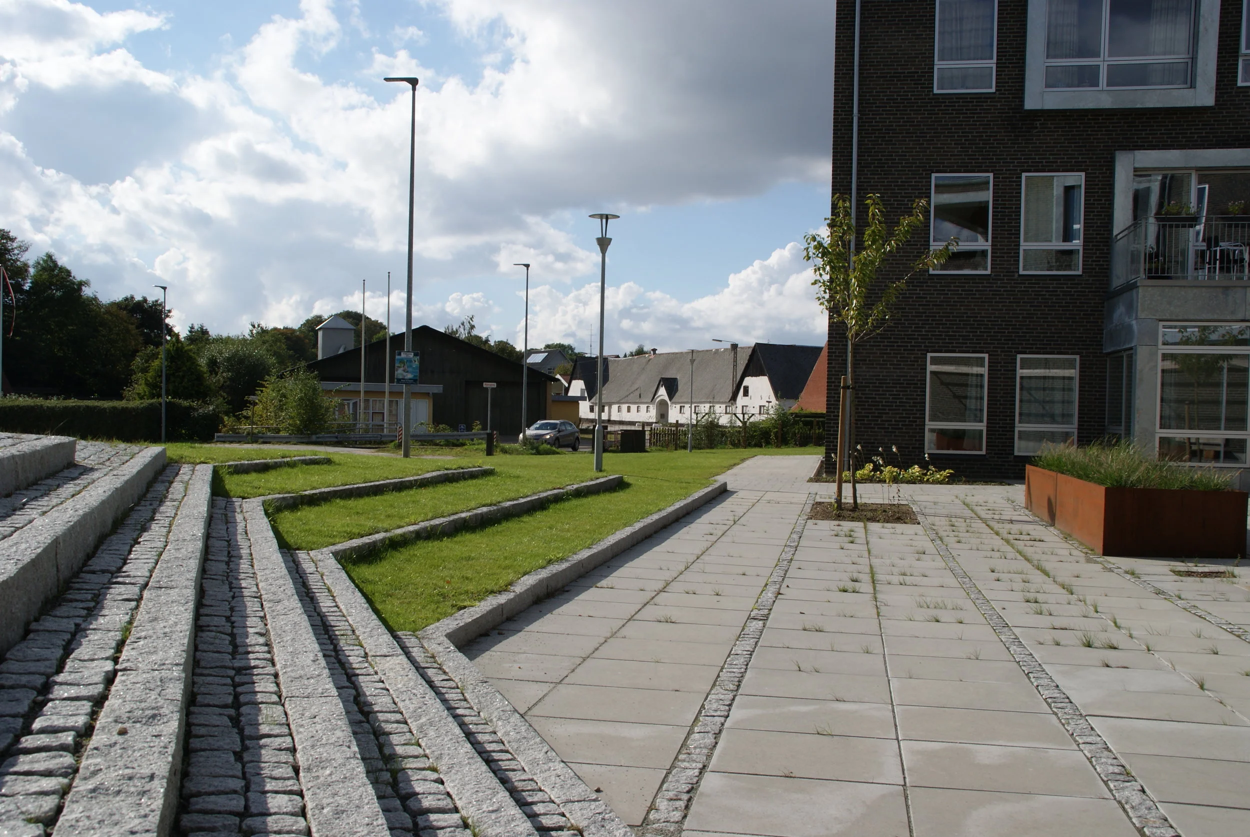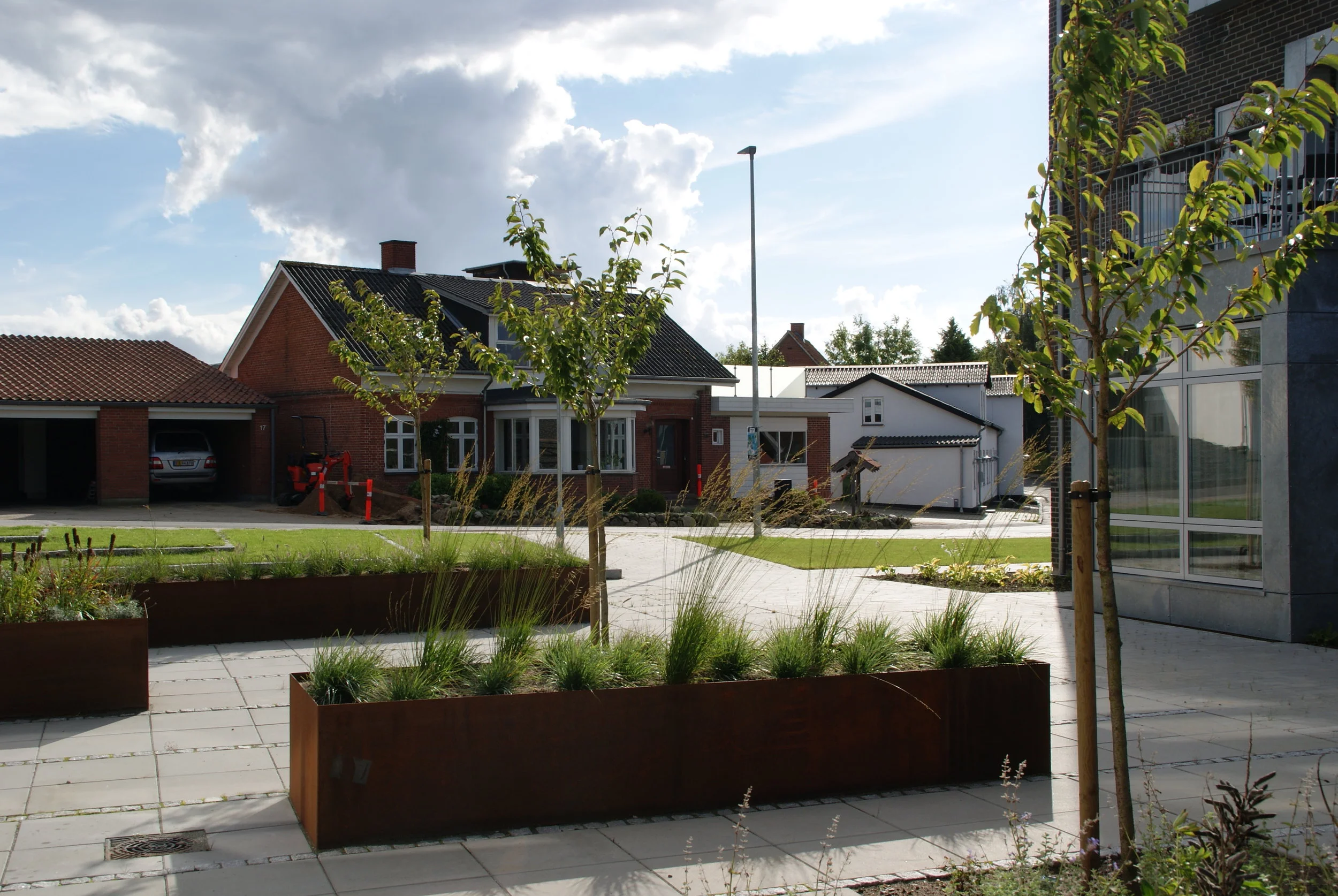 Landskabet omkring plejecentret tager udgangspunkt i genkendelige elementer fra det danske landskab og de danske haver.